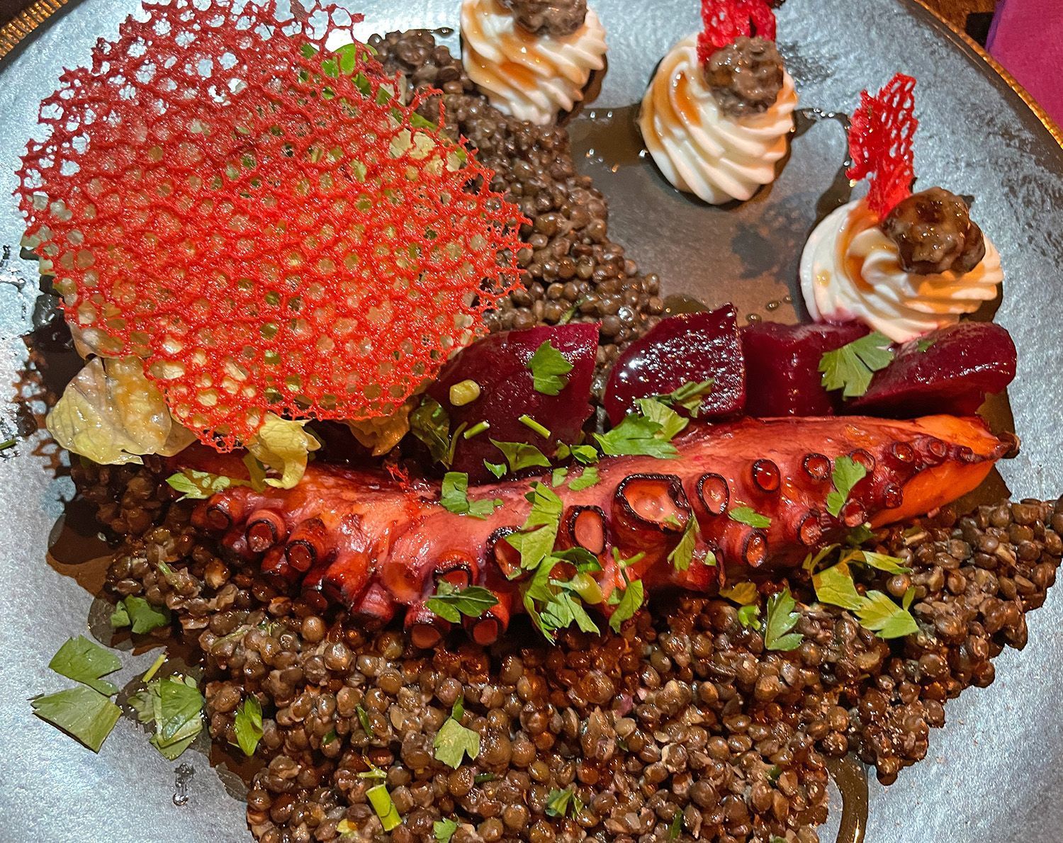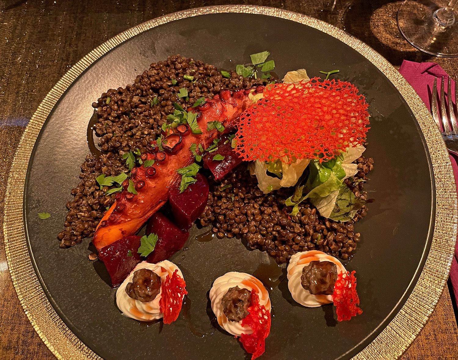 auf hausgemachter Fava aus Hülsenfrüchte, frischem, eigenem Kräuteröl und Balsamicosauce