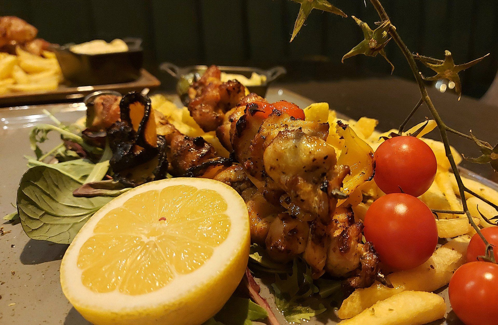 mariniert mit griechischen Gewürzen dazu ein Curry-Tzatziki-Dip und Pommes fites